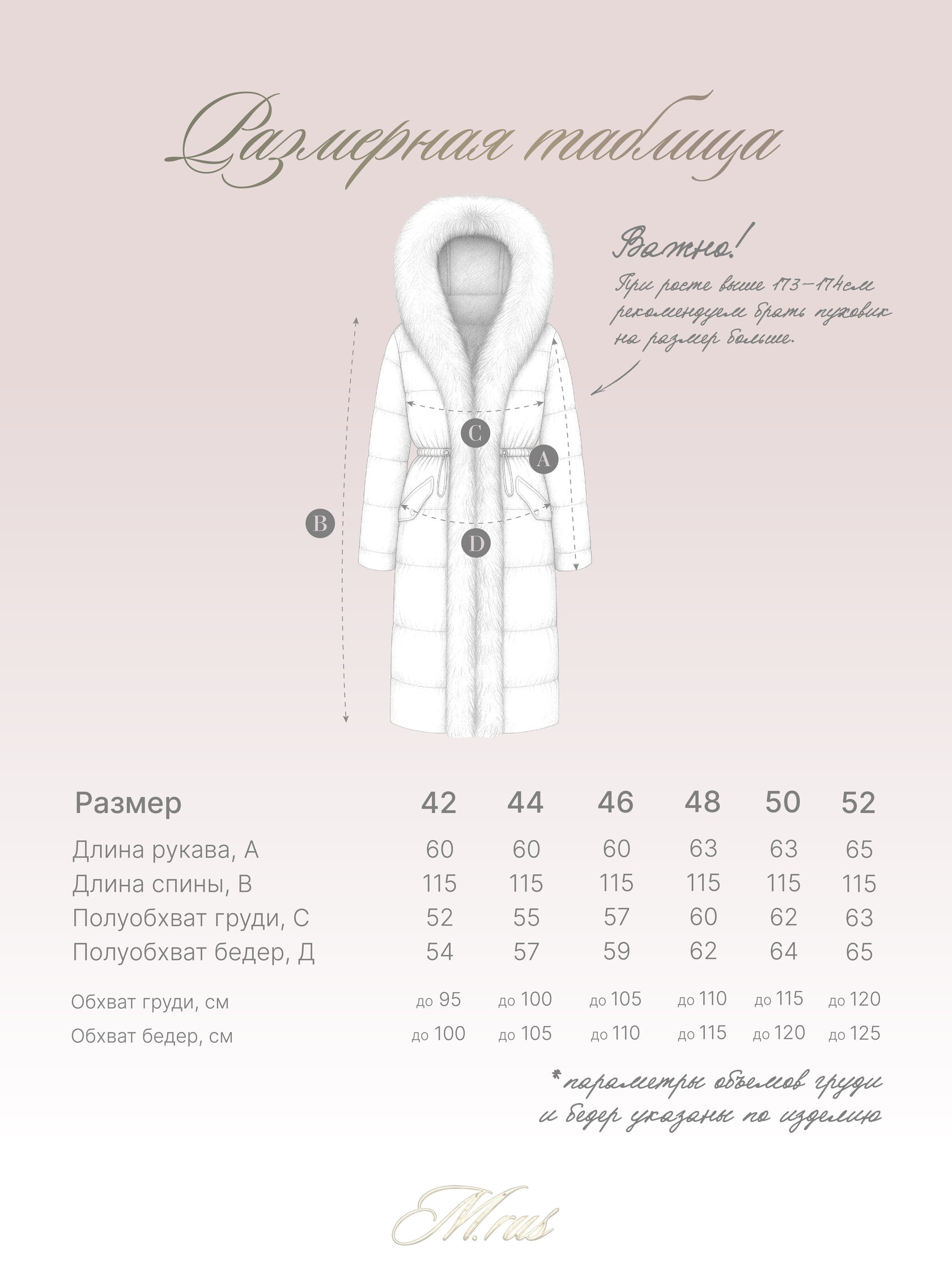 Мех по всему периметру подчёркивает дороговизну и выразительность образа. Пуховик можно носить двумя способами: полностью заправив мех внутрь для усиленной защиты от холода и подчёркивания фигуры — или наоборот, оставив мех снаружи, чтобы продемонстрировать всё богатство фактур и отделки.